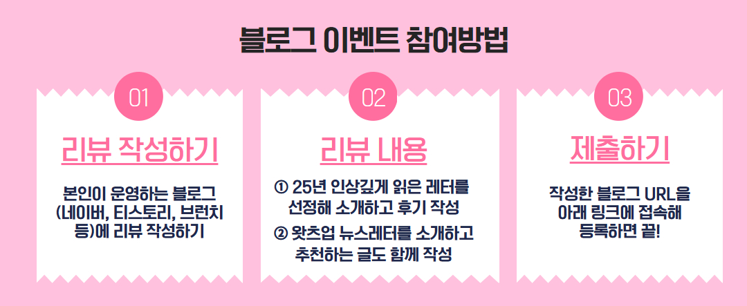왓플 여러분, 왓츠업 뉴스레터 잘 읽고 계신가요? 2025년 여러분이 가장 인상 깊게 읽은 뉴스레터를 선정해, 직접 운영 중인 블로그에 리뷰를 남겨주세요. 참여 해주신 모든 분께 소정의 기프트를 드리며, 특히 정성껏 작성해주신 우수 리뷰어 10분께는 더 풍성한 선물을 준비했습니다.