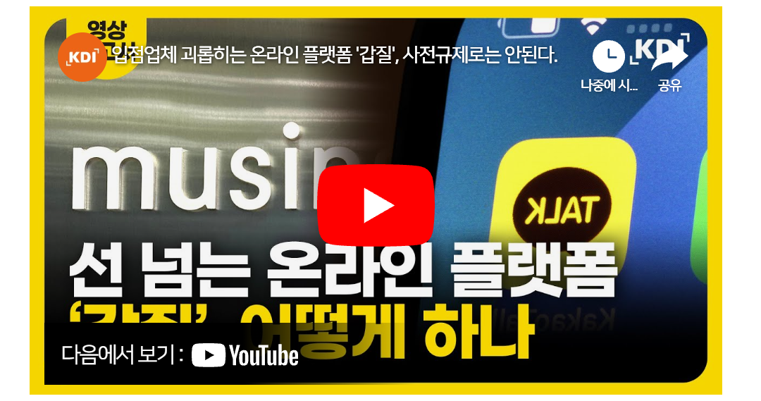 님, 경제지식인을 위한 KDI 왓츠업 뉴스레터를 만나보세요. 배달앱, 이커머스 등에서 입점 업체나 창작자에게 불리한 조건을 강요하는 ‘플랫폼 갑질’이 사회적 문제로 떠오르고 있습니다. 하지만 현행 공정거래법은 전통적 기업 간 거래 구조에 맞춰져 플랫폼의 시장지배력 문제를 해결하기 어렵습니다. 이에 KDI 조성익 박사의 연구와 정책 대안을 소개합니다. |