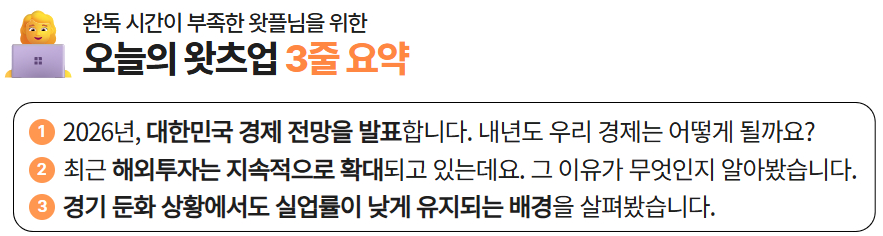 경제지식인을 위한 KDI 뉴스레터 '왓츠업'을 만나보세요. 내년을 잘 준비하려면 경제의 큰 그림, 즉 거시경제 지표를 보는 눈이 필요하죠. 성장률이나 물가 같은 숫자들이 사실은 우리 일상과 기업의 결정에 영향을 주기 때문입니다. 이번 특집호에서는 KDI의 내년도 경제전망을 통해, 변화의 흐름을 짚어보고 미래를 준비하는 인사이트를 전해드립니다. |