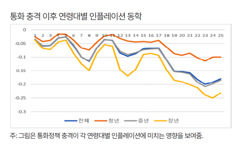 아래 그래프는 긴축적 통화정책 이후 장년층의 인플레이션이 청년층의 인플레이션보다 더 감소했다는 의미이므로, 장년층의 인플레이션이 통화정책 충격에 더 민감하게 반응한 것을 보여줍니다.